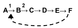 En la siguiente vía metabólica, el sustrato inicial A se transforma por acción de la enzima 1 en B. Luego de sucesivos pasos catalizados por enzimas, se genera el producto final de dicha vía, F. Cuando la cantidad del producto F llegue al nivel requerido por la célula, posiblemente F: