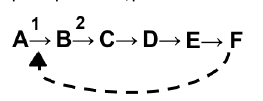 En la siguiente vía metabólica, el sustrato inicial A se transforma por acción de la enzima 1 en B. Luego de sucesivos pasos catalizados por enzimas, se genera el producto final de dicha vía, F. Cuando la cantidad del producto F llegue al nivel requerido por la célula, posiblemente F: