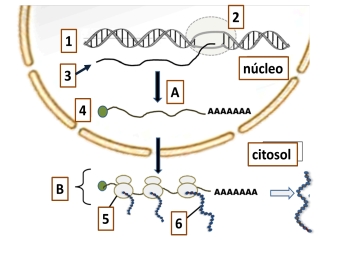 El siguiente esquema representa los diferentes procesos (identificados con letras) y moléculas (números) que participan en la expresión de un gen. Indicá cuál de las siguientes identificaciones es correcta: