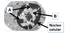 La microfotografía muestra una célula en la que se observa un gran núcleo celular dentro del cual están señaladas dos estructuras : una oscura (A) y otra más clara (B). Indicá la respuesta correcta: