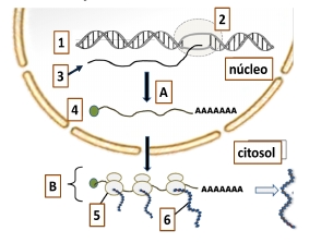 Identificá en la siguiente figura que esquematiza la expresión de un gen, los procesos y estructuras referenciadas con números y letras.