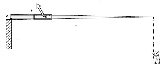 Del extremo derecho de la caña cuelga un pez de 2,75 kg de masa. Un pescador mantiene a la caña en posición horizontal sosteniéndola en el punto "p" ubicado a 70,0 centímetros del punto "o" aplicando la fuerza .